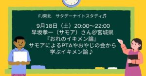 2021年9月16日 / 最終更新日時 : 2021年9月16日 fjt お知らせ・報告 10/16(土)FJ東北 サタデーナイト スタディ 10/16(土)FJ東北 サタデーナイト スタディ 長谷川 聖史さん@秋田県による『子育て世代の節約術』 コメントを残す コメントをキャンセルメールアドレスが公開されることはありません。 ※ が付いている欄は必須項目ですコメント ※ 名前 ※ メール ※ サイト