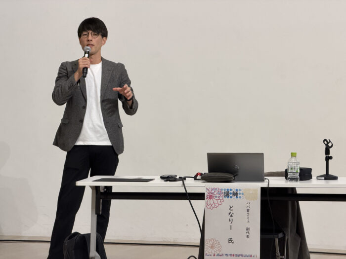 この日はパパ育コミュの副代表「となりー」氏による子育てあるある、パパの子育てを楽しむ秘訣があり、その後のパパのクロストークに参加、秋田での子育て、冬の遊び、パパと子どもの関わり方など実体験を元にお伝えしました。