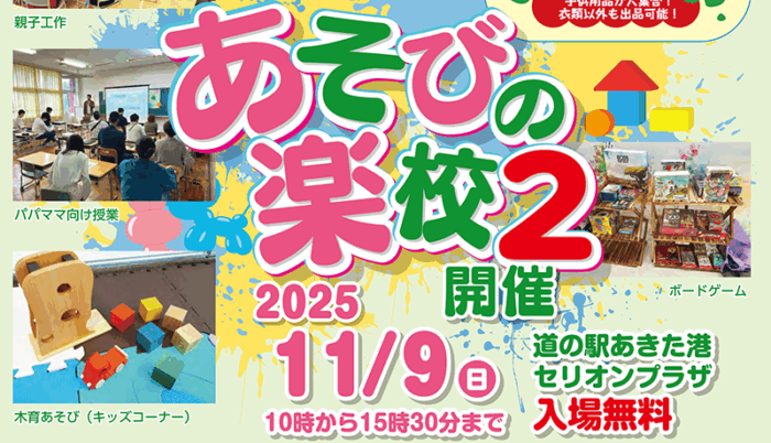 ファザーリング東北フォーラムinあきた『あそびの楽校2』が11月9日(日)秋田市の道の駅あきた港「セリオンプラザ」にて開催されました。事前に告知していた通り親子で子育てを楽しむイベントの通り、キッズフリーマーケット、お菓子の出店、パパママのための講座や親子で楽しむワークショップなど盛りだくさんの内容、当日はあいにくの雨模様にもかかわらず1400名弱の方にご来場いただきました。
